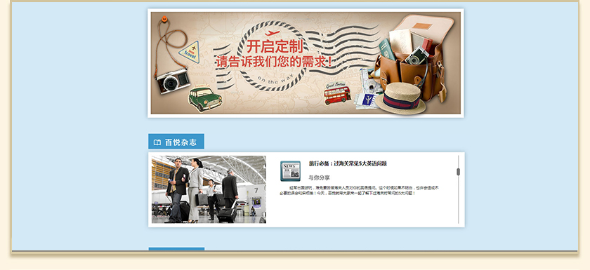 Project Description 百悦逸游于2012年初由二位资深的旅行家创办,是成都传媒集团旗下成都新闻国际旅行社有限公司的高端旅游品牌,总部位于成都高新区天府大道中段美年广场。在百悦逸游成立之前,创始团队亲自到全球三十多个国家实地考察,带着第一手的资讯和执着的信念创立了中国西部第一家真正意义上的私人定制旅行机构。百悦的旅行不是跟团挤大巴,不是十天去十个国家,更不是没完没了的... Official website address 铜梁http://www.100.travel I want to share
